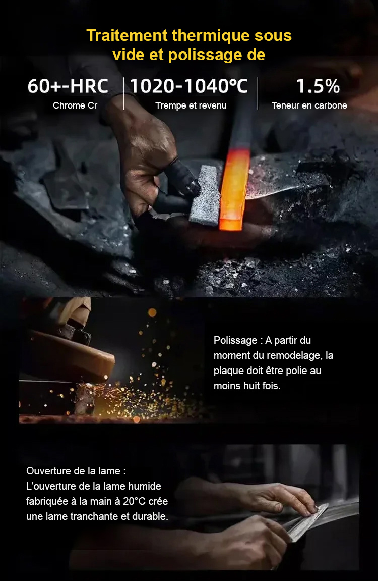 ✅Chaque couteau est forgé à la main 70 fois. Même après avoir coupé des milliers d'os et de viandes, la lame reste aussi tranchante qu'au premier jour, sans aucun besoin d'entretien.